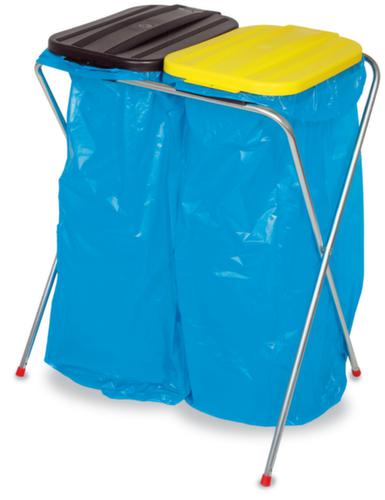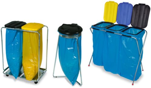 "longDescription": "<h2>Support pour sac poubelle</h2><strong>en tant que support unique ou unité de collecte complète</strong><br><ul><li>Résistant à la rouille et durable - fabriqué en acier galvanisé</li><li>Couvercle en plastique</li><li>Facile à éliminer - avec anneau de serrage et pince en caoutchouc pour fixer le sac poubelle.</li></ul><br><h3>Vous avez le choix :</h3><ul><li>Mobile ou stationnaire - en option avec 4 roulettes pivotantes</li></ul><br>Le support de sac à déchets en acier léger pour les sacs de 70 et 120 litres est polyvalent. En version fixe ou mobile avec 4 roulettes pivotantes, comme simple collecteur de déchets ou en combinaison de deux ou trois pour un simple tri des déchets. À l'aide d'un anneau de retenue et d'une pince en caoutchouc, les sacs à ordures sont simplement fixés au support pour sacs à ordures.<br><br>Les couvercles en plastique coloré permettent de séparer facilement les matériaux recyclables. Le modèle fixe est équipé de patins en plastique qui protègent le sol et permettent de déplacer facilement le support. Le modèle mobile est facile à déplacer grâce à ses 4 roulettes pivotantes et dispose également d'une base galvanisée afin que le sac poubelle ne traîne pas sur le sol lors des déplacements.<br><br><strong>Bon à savoir !</strong><br>Nous vous livrons aussi les sacs poubelle assortis à nos collecteurs de matières recyclables. Il vous suffit de les ajouter à votre commande.<br>",