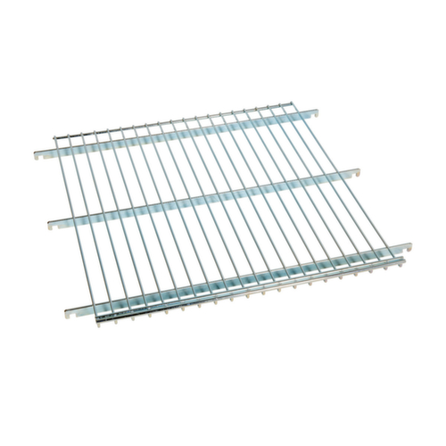 La tablette est accrochée. Avec un cadre hauteur 20 mm contre la chute des objets rangés. en treillis, galvanisé en bleu.