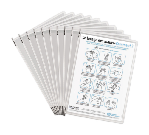 "longDescription": "Panneau de visualisation Sterifold en PVC solide et transparent, en plastique résistant et flexible, encadré d'un fil d'acier coloré recouvert de plastique. <br/> Grâce à une technologie exclusive, les ions d'argent des plaques pochettes Sterifold stoppent la prolifération des microbes et détruisent les micro-organismes qui représentent un danger pour la santé. <br/> Insertion facile et bonne manipulation grâce à des pivots métalliques stables. Sans reflets. <br/> 5 onglets emboîtables 50mm (inserts en carton neutre/couleur). <br/> Format : DIN A4. Pour élément mural, support de table et support tournant. <br/> Ouverture en haut. Couleur blanche. Paquet de 10 pièces<br>",