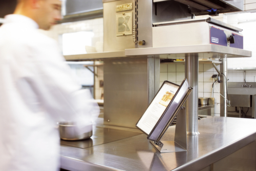 "longDescription": "Support de table stable monté en acier inoxydable, (socle incliné) y compris 10 plaques pochettes Sterifold (antibactériennes) DIN A4 en noir. <br/> Grâce à une technologie exclusive, les ions d'argent des plaques pochettes Sterifold stoppent la prolifération des microbes et détruisent les micro-organismes qui représentent un danger pour la santé. <br/> 5 onglets de 50 mm (inserts en carton neutre/couleur) avec 4 pluggers (embouts de butée) pour un angle de lecture idéal et optimal. <br/> Panneau d'affichage en PVC résistant, flexible et antibactérien, encadré d'un fil d'acier coloré recouvert de plastique. <br/> Pivot en acier inoxydable, donc protégé contre la rouille. <br/> Ouverture en haut. <br/> Le support de table peut être complété par 1 ou 2 éléments muraux Sterifold (414567) pour atteindre 20 à 30 tableaux. <br/> Montage mural possible.<br>",
