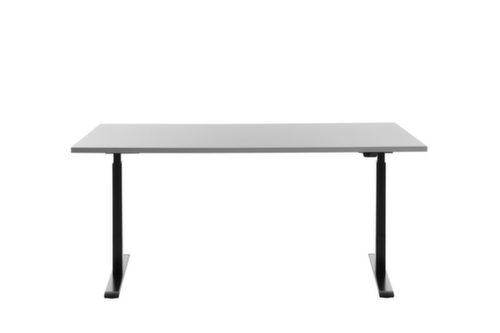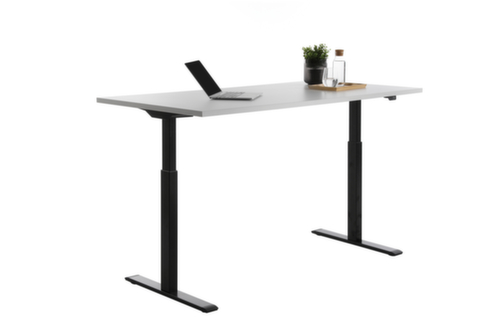 panneau en aggloméré avec revêtement mélaminé, facile d’entretien finition gris. forme de panneau rectangulaire. piètement en T en noir. réglage en hauteur via 2 moteurs électriques facilitent le réglage en hauteur par simple pression d'un bouton. fonctions : Mémorisation et rappel automatique des hauteurs de table programmées grâce à la fonction mémoire. La protection anti-collision automatique s'arrête immédiatement en cas de résistance du haut ou du bas et garantit ainsi une protection absolue.