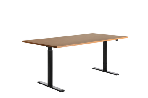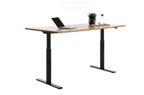 panneau en aggloméré avec revêtement mélaminé, facile d’entretien finition hêtre. forme de panneau rectangulaire. piètement en T en noir. réglage en hauteur via 2 moteurs électriques facilitent le réglage en hauteur par simple pression d'un bouton. fonctions : Mémorisation et rappel automatique des hauteurs de table programmées grâce à la fonction mémoire. La protection anti-collision automatique s'arrête immédiatement en cas de résistance du haut ou du bas et garantit ainsi une protection absolue.