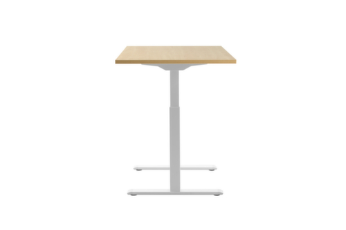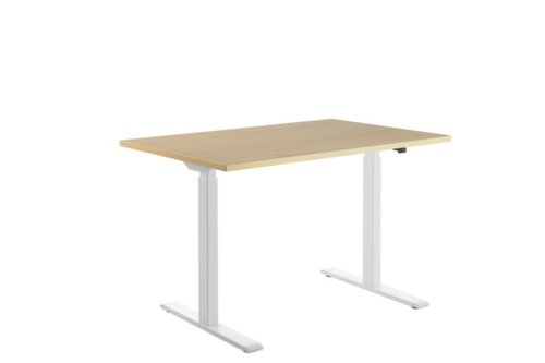 panneau en aggloméré avec revêtement mélaminé, facile d’entretien finition érable. forme de panneau rectangulaire. piètement en T en blanc. réglage en hauteur via 2 moteurs électriques facilitent le réglage en hauteur par simple pression d'un bouton. fonctions : Mémorisation et rappel automatique des hauteurs de table programmées grâce à la fonction mémoire. La protection anti-collision automatique s'arrête immédiatement en cas de résistance du haut ou du bas et garantit ainsi une protection absolue.