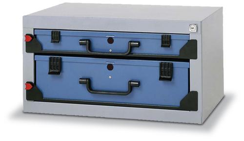 en acier, corps avec finition époxy résistante aux chocs et aux rayures en RAL7000 gris petit-gris. Grâce aux glissières télescopiques à billes, les bacs s’ouvrent et se ferment très facilement, même en cas de charge élevée. L’extension totale permet un accès facile à 100% dans tous les coins. Le blocage d'extension individuel empêche l'ouverture simultanée de plusieurs tiroirs et, par là même, un basculement. Verrouillable par serrure de sécurité. 2 mallette. mallette en acier. mallette avec finition époxy résistante aux chocs et aux rayures en RAL5007 bleu brillant. bacs en de couleur.