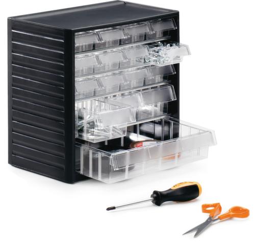 boîtier en polypropylène incassable / tiroirs en polystyrène résistant aux chocs. tiroirs en transparent. fond de tiroir ondulé pour une préhension aisée de petits articles. tablettes en acier, avec revêtement en zinc anti-corrosion.