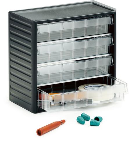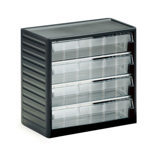 boîtier en polypropylène incassable / tiroirs en polystyrène résistant aux chocs. tiroirs en transparent. fond de tiroir ondulé pour une préhension aisée de petits articles. tablettes en acier, avec revêtement en zinc anti-corrosion.