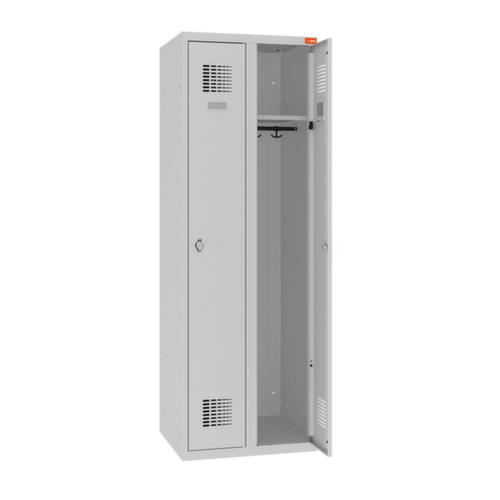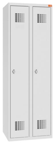 par compartiment 1 tablette à chapeaux, 1 tringle avec 2 crochets, miroir dans la porte. porte battante a. porte-étiquette. Les portes à recouvrement offrent l’avantage de ne pas perdre de place dans l’armoire, car elles ne prennent pas de place à l’intérieur de l’armoire. verrouillable avec serrure porte-cadenas. Les perforations WEMO standardisées assurent une circulation optimale de l'air à l'intérieur de l'armoire. Le socle encastré permet de répartir uniformément le poids de l’armoire sur le sol. Cela augmente la stabilité et l’armoire peut supporter des charges plus lourdes qu’une armoire à pieds. De plus, la saleté, la poussière et l’humidité ne peuvent pas s’infiltrer sous l’armoire, ce qui réduit la surface de nettoyage. structure en tôle d'acier. corps avec revêtement de zirconium non corrosif en RAL7035 gris clair, face avant avec revêtement de zirconium non corrosif en RAL7035 gris clair.