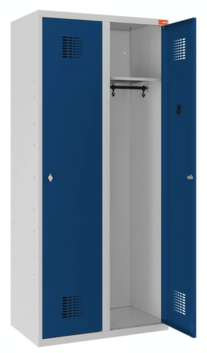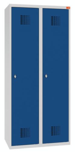 par compartiment 1 tablette à chapeaux, 1 tringle avec 2 crochets, miroir dans la porte. porte battante a. porte-étiquette. Les portes à recouvrement offrent l’avantage de ne pas perdre de place dans l’armoire, car elles ne prennent pas de place à l’intérieur de l’armoire. verrouillable avec serrure porte-cadenas. Les perforations WEMO standardisées assurent une circulation optimale de l'air à l'intérieur de l'armoire. Le socle encastré permet de répartir uniformément le poids de l’armoire sur le sol. Cela augmente la stabilité et l’armoire peut supporter des charges plus lourdes qu’une armoire à pieds. De plus, la saleté, la poussière et l’humidité ne peuvent pas s’infiltrer sous l’armoire, ce qui réduit la surface de nettoyage. structure en tôle d'acier. corps avec revêtement de zirconium non corrosif en RAL7035 gris clair, face avant avec revêtement de zirconium non corrosif en RAL5010 bleu gentiane.