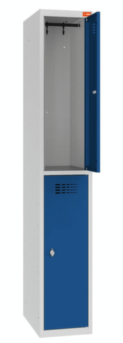 par compartiment 1 tringle avec 2 doubles crochets et 1 tablette par compartiment. Une porte battante par compartiment pour protéger le contenu. Les portes à recouvrement offrent l’avantage de ne pas perdre de place dans l’armoire, car elles ne prennent pas de place à l’intérieur de l’armoire. verrouillable avec serrure porte-cadenas. Les perforations WEMO standardisées assurent une circulation optimale de l'air à l'intérieur de l'armoire. structure en tôle d'acier. corps avec revêtement de zirconium non corrosif en RAL7035 gris clair, face avant avec revêtement de zirconium non corrosif en RAL5010 bleu gentiane.