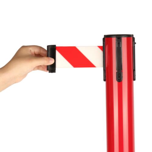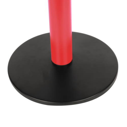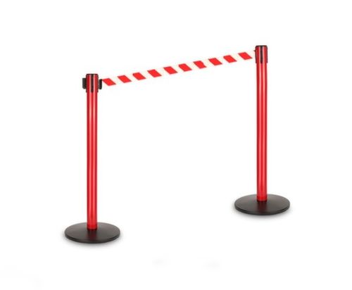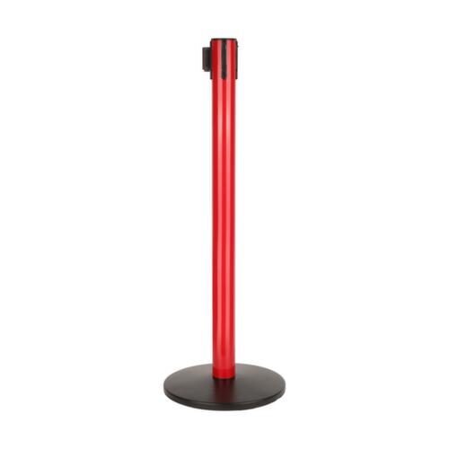 Les principales dimensions du UDOBÄR système de barrières en un coup d’œil :pied rond. courroie en polyester coloris rouge/blanc. sangle se rétracte automatiquement. montant en plastique coloris rouge. pied en fer de fonte en noir. à poser au sol.