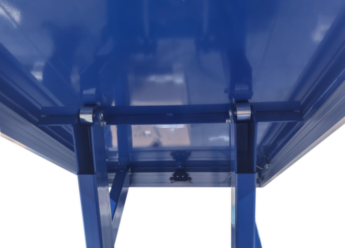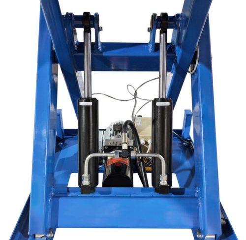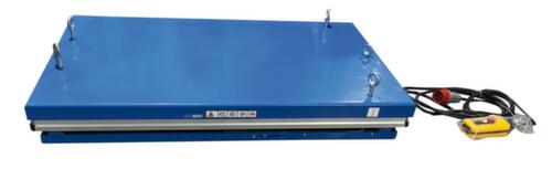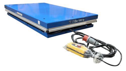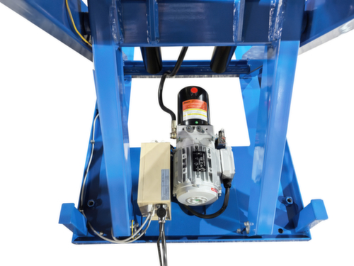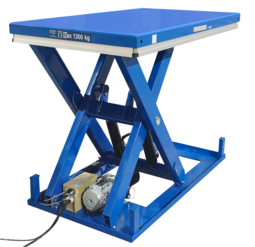 en acier avec finition époxy résistante aux chocs et aux rayures coloris RAL5017 bleu signalisation. exécution de la levée électrique avec bouton-poussoir de levage et de descente. cisaille simple en acier avec finition époxy résistante aux chocs et aux rayures en RAL5017 bleu signalisation. structure acierrigide. plateforme avec trous de fixation dans la surface de base. Si nécessaire, les anneaux de levage fournis peuvent y être vissés afin de pouvoir transporter la table élévatrice en toute sécurité avec un harnais. câble longueur 3,5 m. Avec 400 V/50 Hz. indice de protection IP54 : la poussière se dépose à l'intérieur, projections d'eau dans toutes les directions. classe d'isolation F.