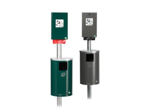 "longDescription": "<h2>Toilettes pour chiens</h2><ul><li>Pour un montage mural ou sur poteau</li><li>Immédiatement prêt à l'emploi grâce aux poteaux fournis.</li><li>Fabriqué en tôle d'acier galvanisée avec revêtement en poudre</li><li>Y compris l'autocollant du pictogramme et le matériel de montage</li></ul><br><h3>Distributeur :</h3><ul><li>Offre de l'espace pour 200 sacs</li><li>L'avant peut être complètement rabattu pour le remplissage</li><li>Serrure triangulaire avec une clé</li></ul><br><h3>Conteneur à déchets :</h3><ul><li>Capacité de 30 litres</li><li>Couvercle supérieur galvanisé</li></ul><br><strong>Bon à savoir !</strong><br>Ajoutez les sachets assortis à votre commande. Ils sont disponibles dans un lot avantageux de 1.000 pièces.<br>",