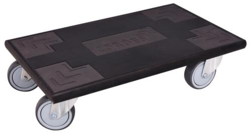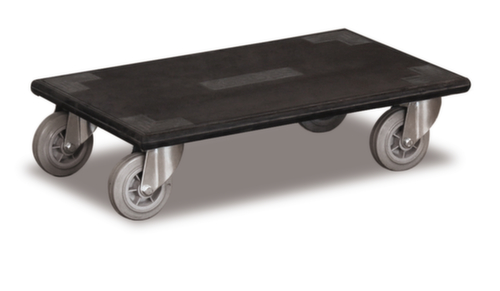 plateforme plein. plateforme en contreplaqué avec revêtement en caoutchouc, avec amortisseur caoutchouc sur le pourtour comme protection anticollision pour les murs et les portes. structure coloris noir. Manœuvre et déplacement aisés grâce à 4 roulettes pivotantes. Ø de roue 100 mm. avec bandage TPE préservant le sol.