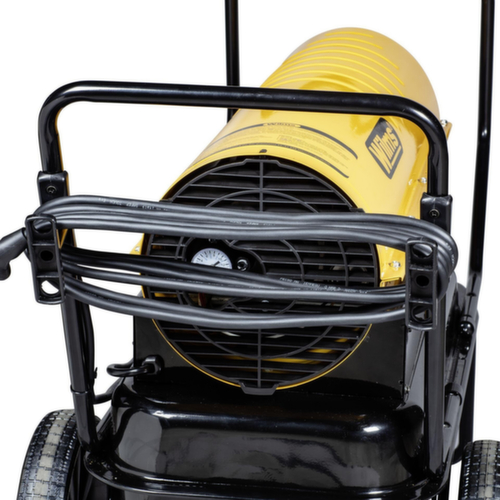 combustion sans résidus grâce au système de pulvérisation à basse pression, fonctionnement automatique à température contrôlée possible par thermostat d'ambiance. manutention facile avec poignée de transport. soubassement avec roues. en jaune.