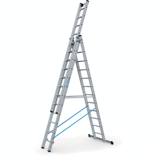"longDescription": "<h2>Échelle combinée multifonctionnelle</h2><strong>une échelle, plusieurs fonctions</strong><br><ul><li><strong>Force particulièrement élevée</strong> - de 150 kg contrairement à la norme</li><li><strong>Pour un transport ergonomique</strong> - Échelle supérieure avec châssis supérieur et roulette dans la traverse</li><li><strong>Surface antidérapante</strong> - échelons striés</li><li>Raccordement d'un barreau à bride</li><li><strong>Utilisation sûre</strong> -sangles en perlon haute résistance comme protection contre l'écartement</li><li><strong>Excellente stabilité sans pliage accidentel</strong> grâce aux traverses rigides- <strong>Bonne stabilité</strong> grâce aux pieds en plastique</li><li>Léger et robuste - fabriqué en aluminium</li></ul><br><h3>Le choix vous appartient :</h3><ul><li><strong>Pour une sortie facile de l’échelle supérieure</strong> au choix avec des roulettes murales</li><li><strong>Stabilité supplémentaire</strong> - Au choix avec des marches ultra basses sur l’échelle supérieure</li></ul><br>Cette échelle polyvalente de Zrages est parfaitement adaptée à une utilisation industrielle, même au plus haut niveau. La conception en trois parties peut être combinée comme un escabeau ou une échelle à coulisse et peut être commandée avec différents nombres d'échelons et être utilisée pour les escaliers. La construction robuste porte la marque GS et bénéficie d'une garantie de 10 ans.<br><br>Tous les modèles sont équipés d'un dispositif anti-soulèvement au sommet de l'échelle pour éviter tout décrochage involontaire et sont fabriqués en aluminium. Les raccordements échelon-cloche bridés, les profilés en aluminium extrudé à haute résistance sans soudure et les deux sangles très résistantes à la déchirure, qui servent à empêcher l'écartement, offrent une protection particulière. Les échelons carrés profilés antidérapants et les pieds d'échelle antidérapants à deux composants aux extrémités des montants garantissent une station debout sûre. La version industrielle normale comprend une large traverse et une connexion rigide comme dispositif anti-écoulement. <br><br>La version destinée à un usage intensif offre une traverse extra-large, deux connexions rigides comme protection contre les écarts et une échelle supérieure comme protection contre les écarts. Ceci est crucial pour les travaux prolongés avec l'échelle.<br><br><strong>Critères de qualité</strong><br><ul><li>Assurance qualité conform. à DIN EN 131 Professional</li><li>Conform. à DGUV 208-016 (anciennement BGI 694)</li></ul>",